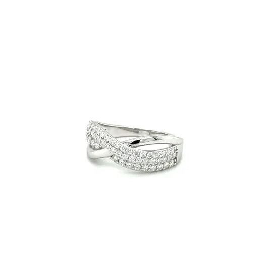 PLATINUM PLATED SILVER THROUGH THICK AND THIN CRISS CROSS MOISSANITE RING W/ HIGH POLISH AND POETRY CARD