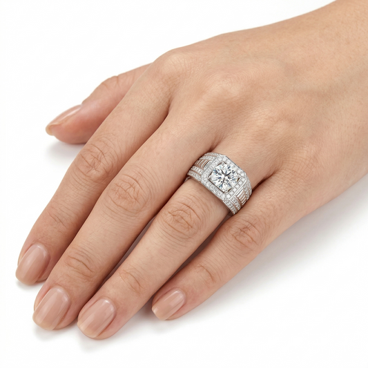 Wide Band White Gold Plated Moissanite Ring 1ct Center Stone