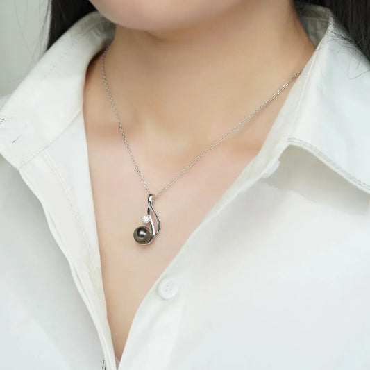 18K WHITE GOLD PLATED SILVER 9-10MM TAHITIAN BLACK PEARL AND 0.3CT MOISSANITE PENDANT NECKLACE