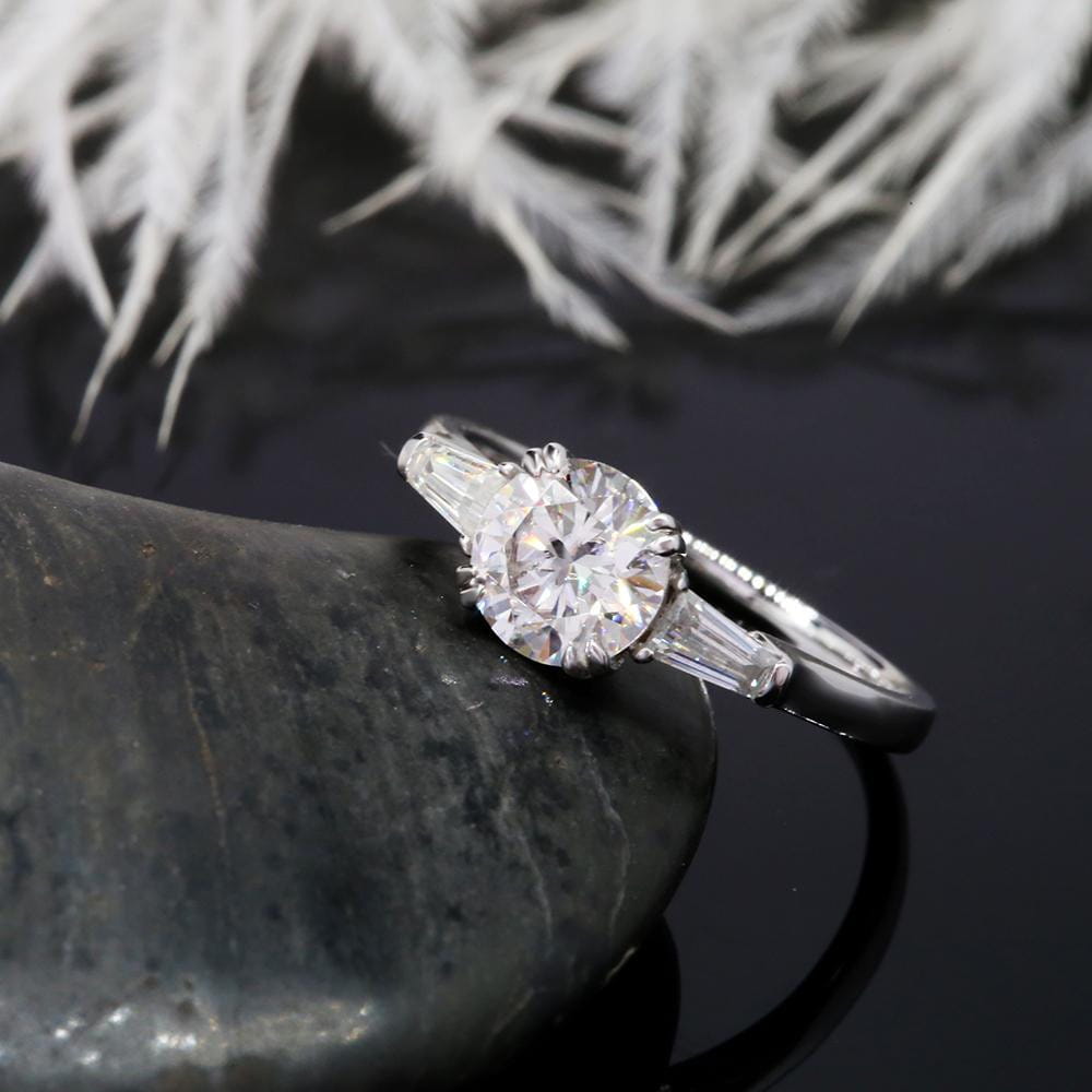 Shape\pattern: Round 1 carat center stone, also has an additional 2 emerald moissanite stones, one on each side.