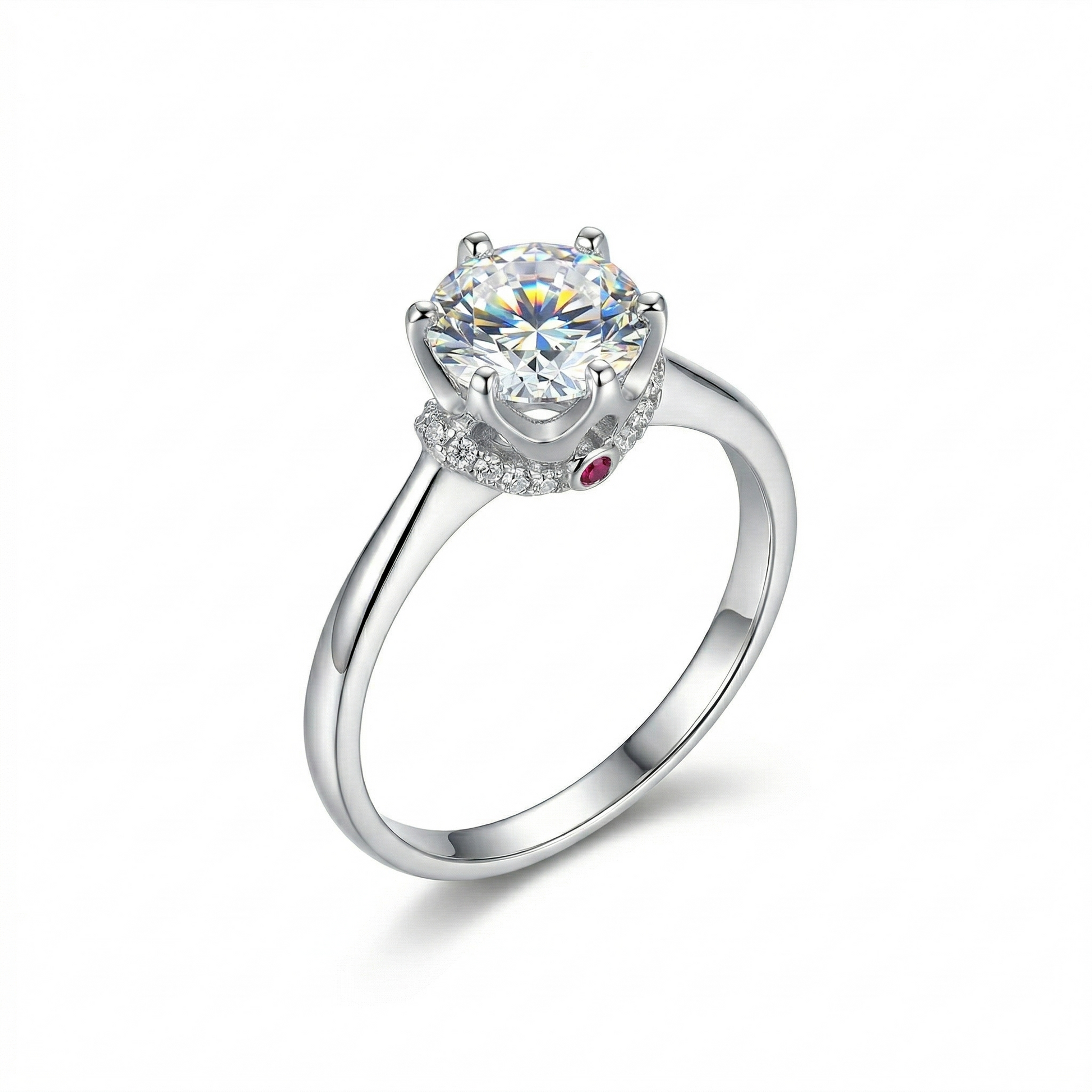 Moissanite Stone: The center stone comes in 1 carat (6.5mm) and 0.5 carat (5mm) options. It also has additional surrounding moissanite stones and a small ruby on either side.